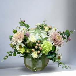 Price: $40.00Silk Flowers and Succulent Pumpkin Dish